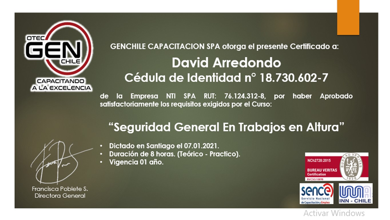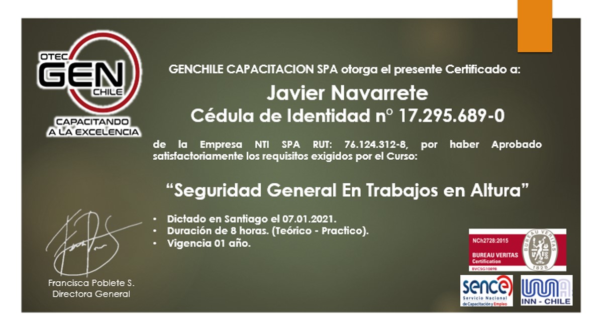 de la Empresa NTI SPA RUT: 76.124.312-8, por haber Aprobado satisfactoriamente los requisitos exigidos por el Curso:
